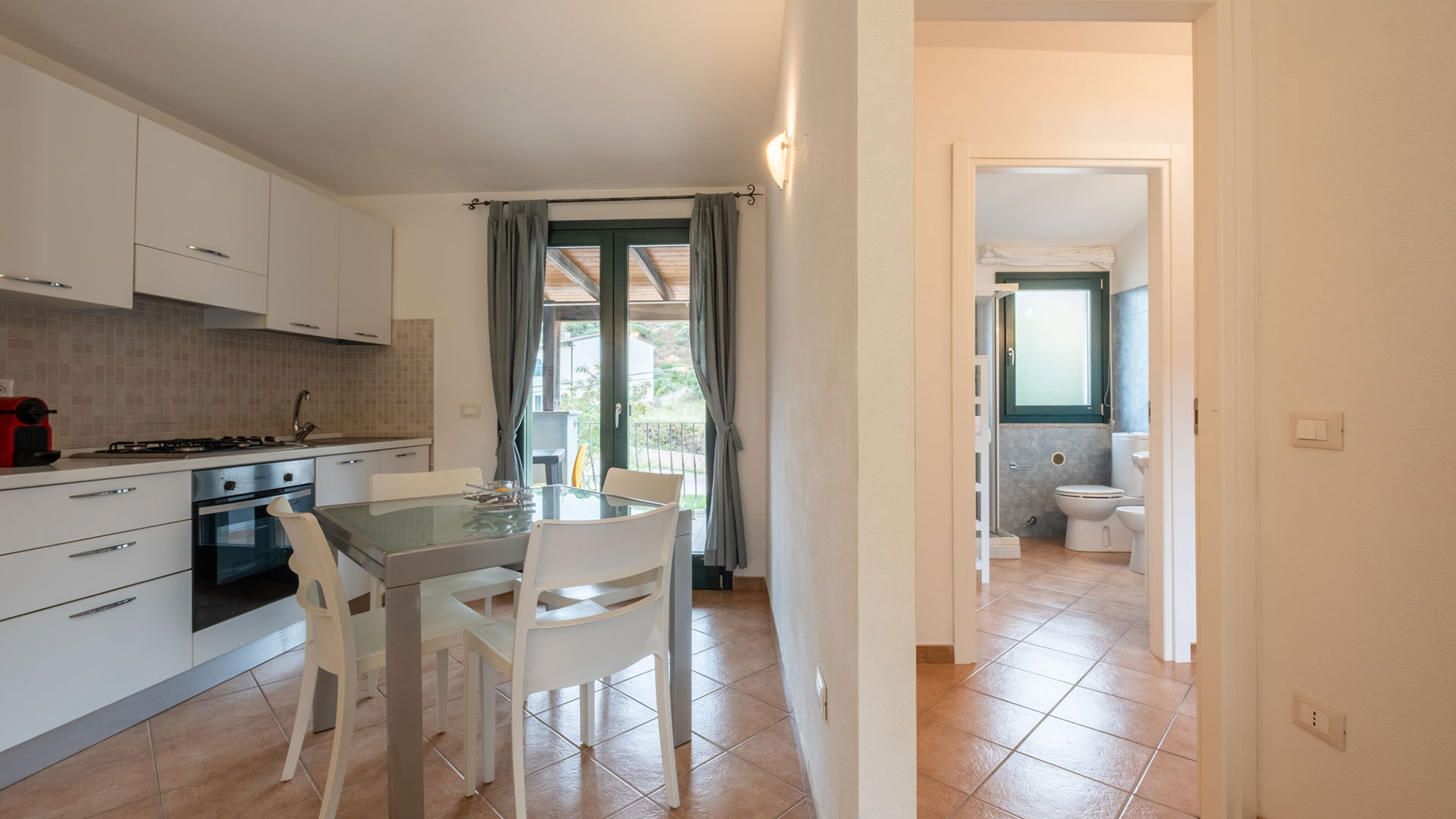 Bilocale al primo piano con terrazzo privato, pensato per chi cerca luce e spazi da vivere lentamente. Offre una camera matrimoniale, bagno e zona giorno con cucina e divano letto. Il terrazzo è ideale per colazioni all’aperto e momenti di relax dopo il mare.